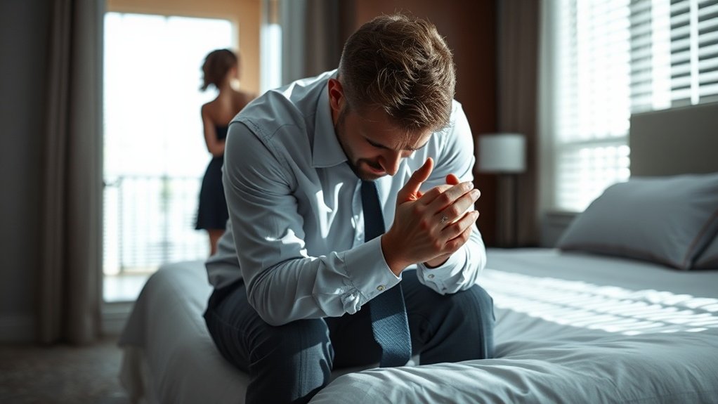 Guilt-ridden cheaters typically display six distinct behavioral patterns that reveal their internal turmoil. They often overcompensate through excessive kindness and expensive gifts that feel forced rather than genuine. When questioned, they respond with disproportionate anger to deflect scrutiny. Emotional withdrawal becomes common as they avoid intimacy and meaningful conversations. They frequently shift blame onto their partner or circumstances to escape accountability. Partial confessions of lesser wrongdoings provide temporary relief while concealing the full truth. Understanding these patterns helps identify the deeper psychological mechanisms at work.