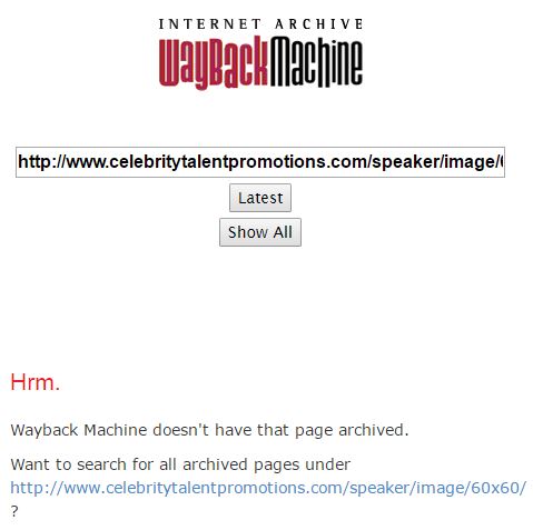 Let’s take a look at the celebritytalentpromotions.com site again. If we look for the full link we got from Tineye http://www.celebritytalentpromotions.com/speaker/image/60×60/meredith-mciver.jpg
