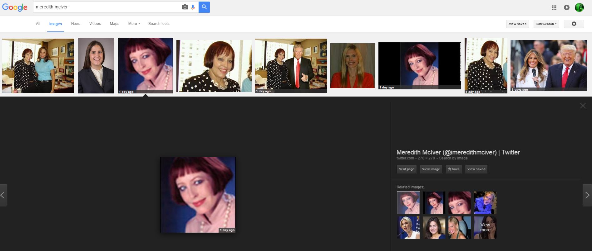 Searching her name brings up an onslaught of media links to stories about how she is or isn’t a real person. I don’t want the media’s coverage of this so I’m going to take a different approach. Clicking the ‘images’ tab in Google gives us several photos that have surfaced of Meredith. I picked one that is a profile photo from a twitter account.