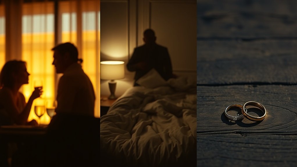 Infidelity typically follows a predictable pattern of behavioral changes across three distinct phases. Initially, partners experience emotional withdrawal, decreased intimacy, and communication breakdown as the unfaithful spouse creates distance. Digital secrecy emerges through password protection and deleted messages, while unexplained schedule changes and defensive reactions become common. Guilt manifests as overcompensation through sudden romantic gestures or excessive helpfulness. Mood swings and personality changes intensify as psychological strain increases. Understanding these warning signs can provide essential insight into relationship dynamics and the complex emotional journey that unfolds throughout this difficult process.